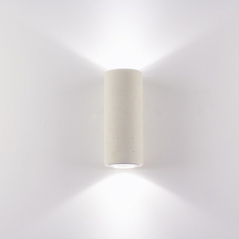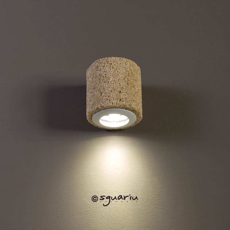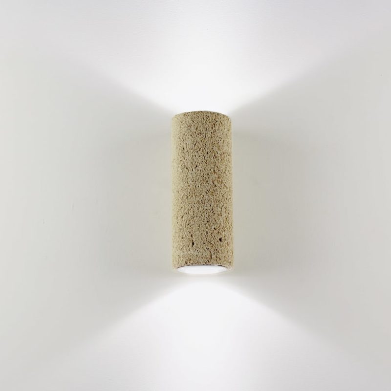 Applique Cilindro in pietra leccese, dimensioni h 40×15 cm ospita 2 portalampada E27, lampadine led 15W luce calda 1200 Lumen acquistabili nella confezione.