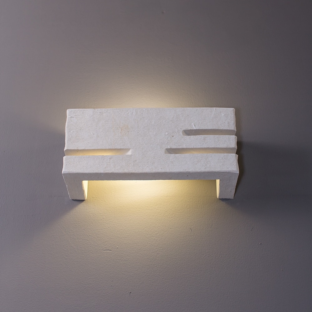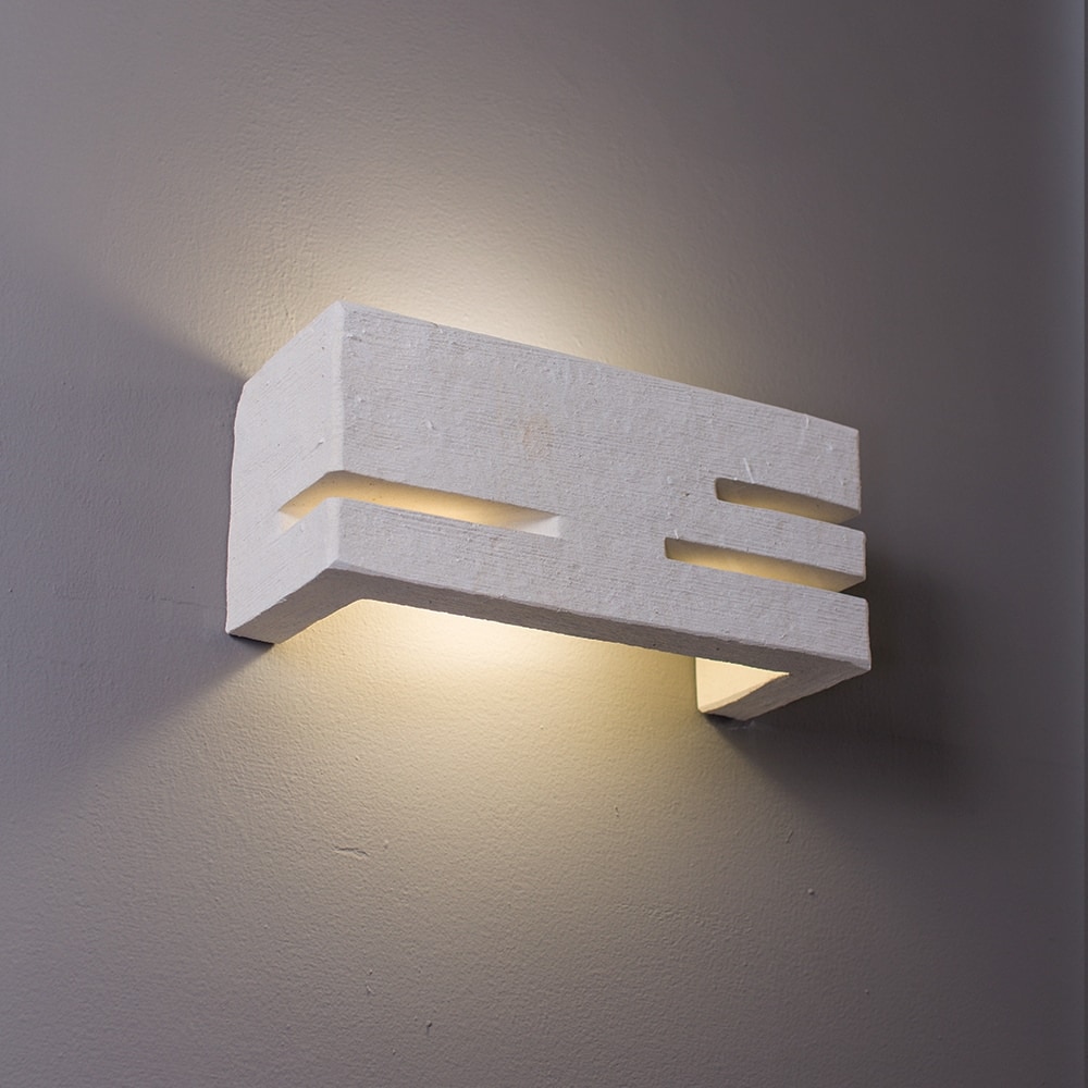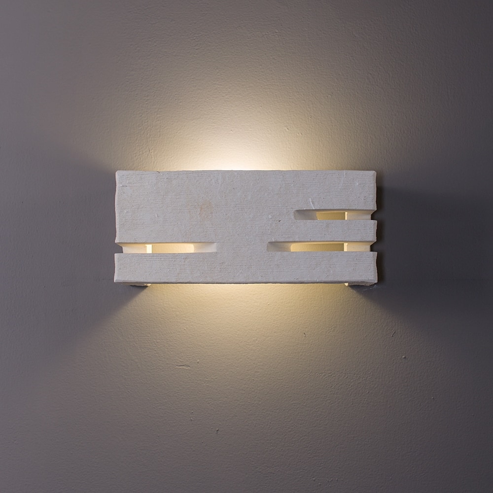 I tagli orizzontali regalano a questa lampada un’aspetto pulito ed elegante, oltre a generare interessanti giochi di luce filtrata attraverso le aperture superiore ed inferiore e dalle fessure nella pietra. Le appliques hanno un portalampada ad attacco E27* che può alloggiare lampadine a risparmio energetico oppure led, in base alle preferenze.