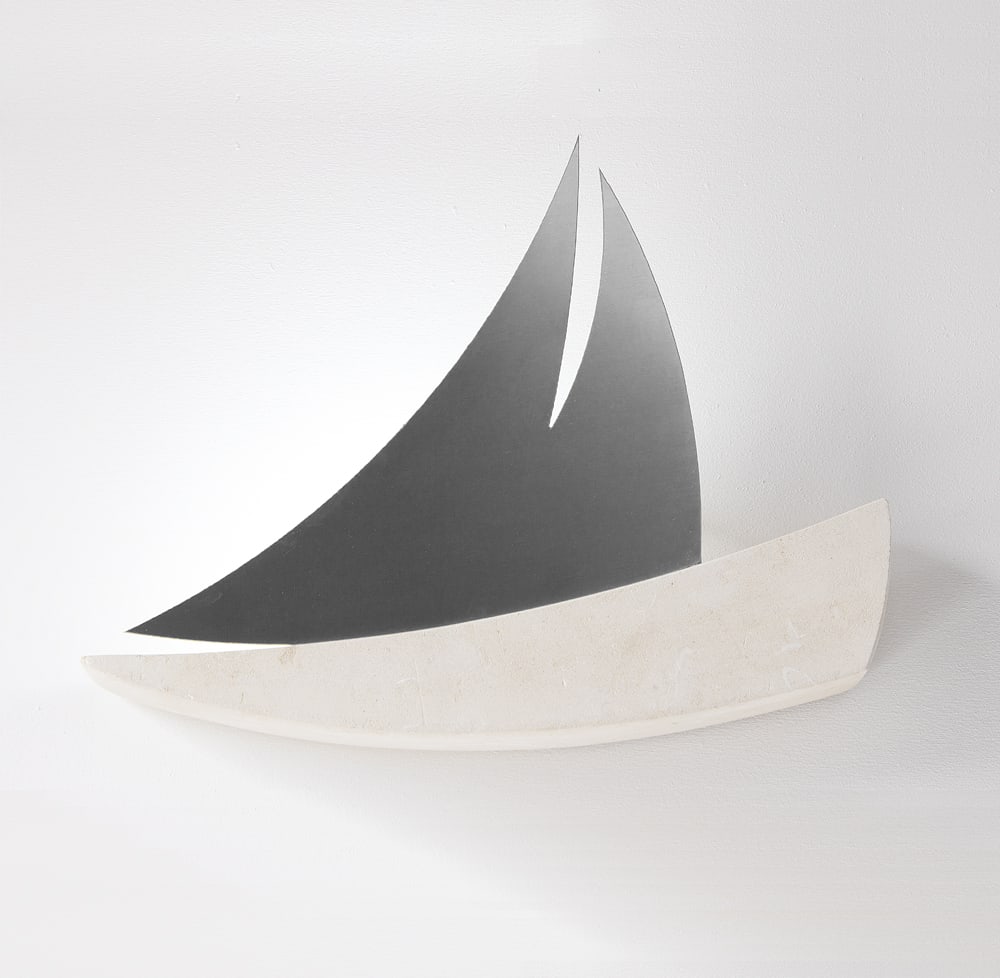 Applique moderna in pietra leccese e acciaio satinato che raffigura una barca a vela stilizzata. Dispone di un portalampada con attacco E27 (lampadina non inclusa).