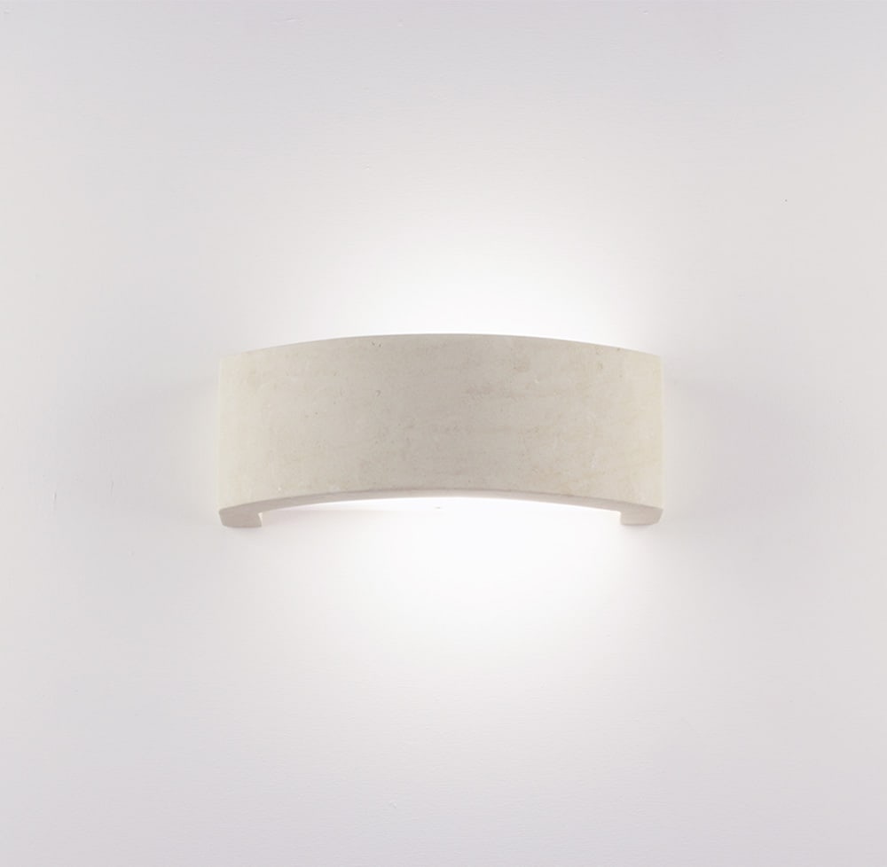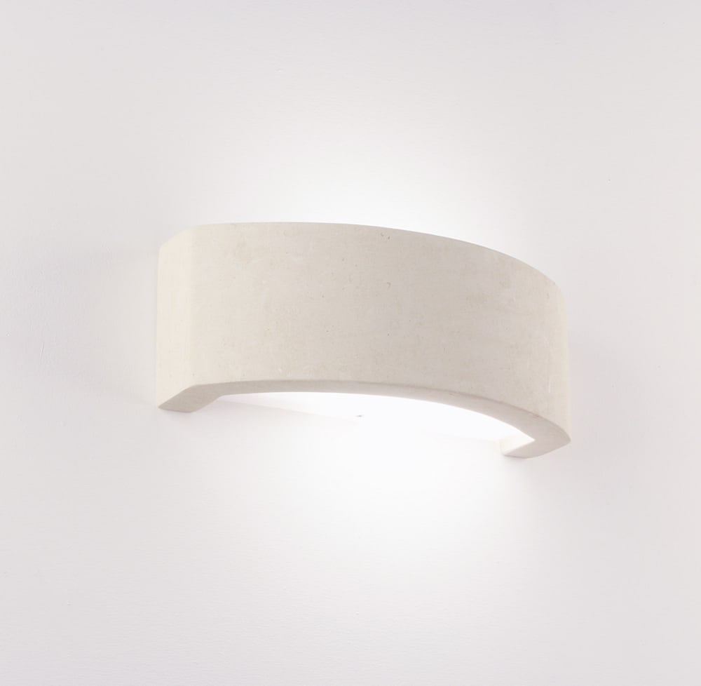 Curvy, l’applique curva per esterno, è un nuovo modello di lampada in pietra leccese lavorata artigianalmente, adatta ad installazioni all’aperto, con codice IP44, che garantisce una protezione da spruzzi in qualsiasi direzione.