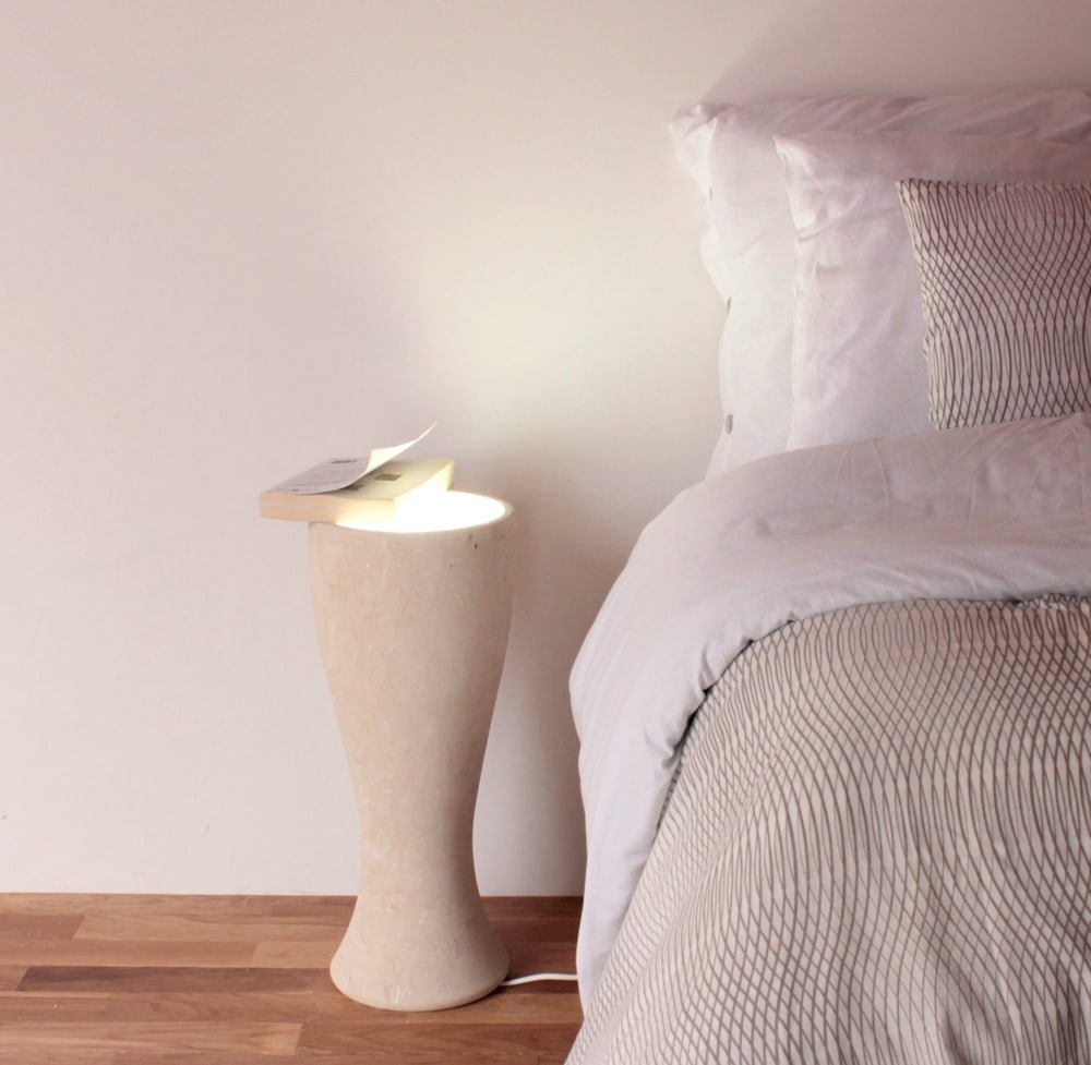 Il prodotto è interamente realizzato in pietra e dispone di un porta lampade interno (lampadina esclusa) con attacco E27 e un piano poggia oggetti in plexiglass satinato, disponibile in vari colori a seconda della colorazione che si vorrà dare alla luce emanata dalla lampada.