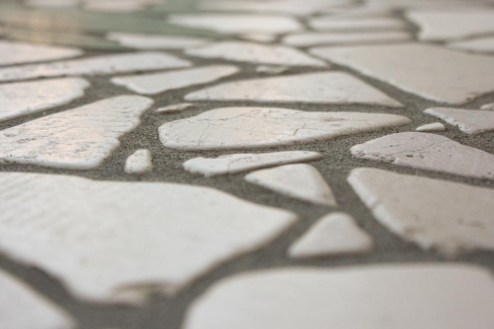 Pavimento Palladiana marmo per esterni o per interni, composto da elementi irregolari in marmo di Trani burattati di colore grigio chiaro. Spessore 2 cm, dimensioni contenute in diametri variabili tra 15 e 8 cm. . Disponibile anche palladiana per rivestimento di pareti, zoccolature e cucine in muratura, con spessore 1,5 cm.